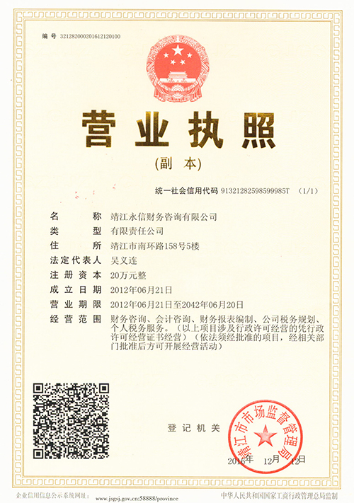 靖江永信財務(wù)咨詢有限公司是依法注冊成立的專業(yè)財稅代理機構(gòu)。公司主要業(yè)務(wù)為:代辦公司營業(yè)執(zhí)照、注冊各類公司、代理記賬報稅,代理商標(biāo)注冊,工商年檢,稅務(wù)登記年檢,企業(yè)清理注銷等,注冊香港公司,代辦申請一般納稅人資格認(rèn)定,公司專業(yè)為中小企業(yè)進(jìn)行納稅籌劃,代理記賬報稅,企業(yè)內(nèi)部審計;同時也專業(yè)代理進(jìn)出口經(jīng)營權(quán)申請。